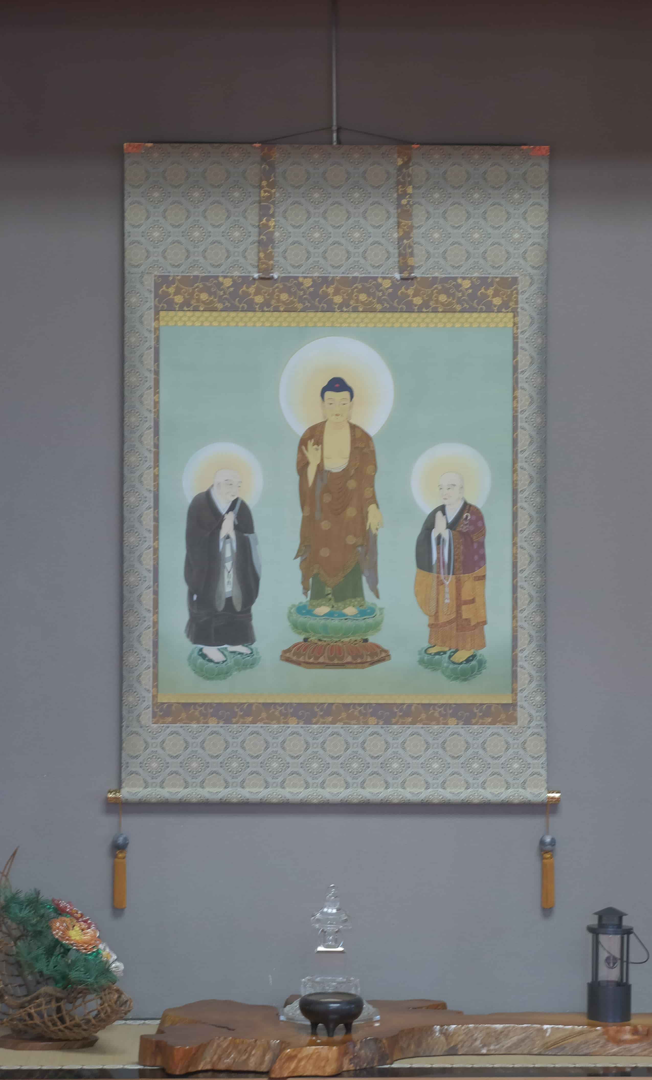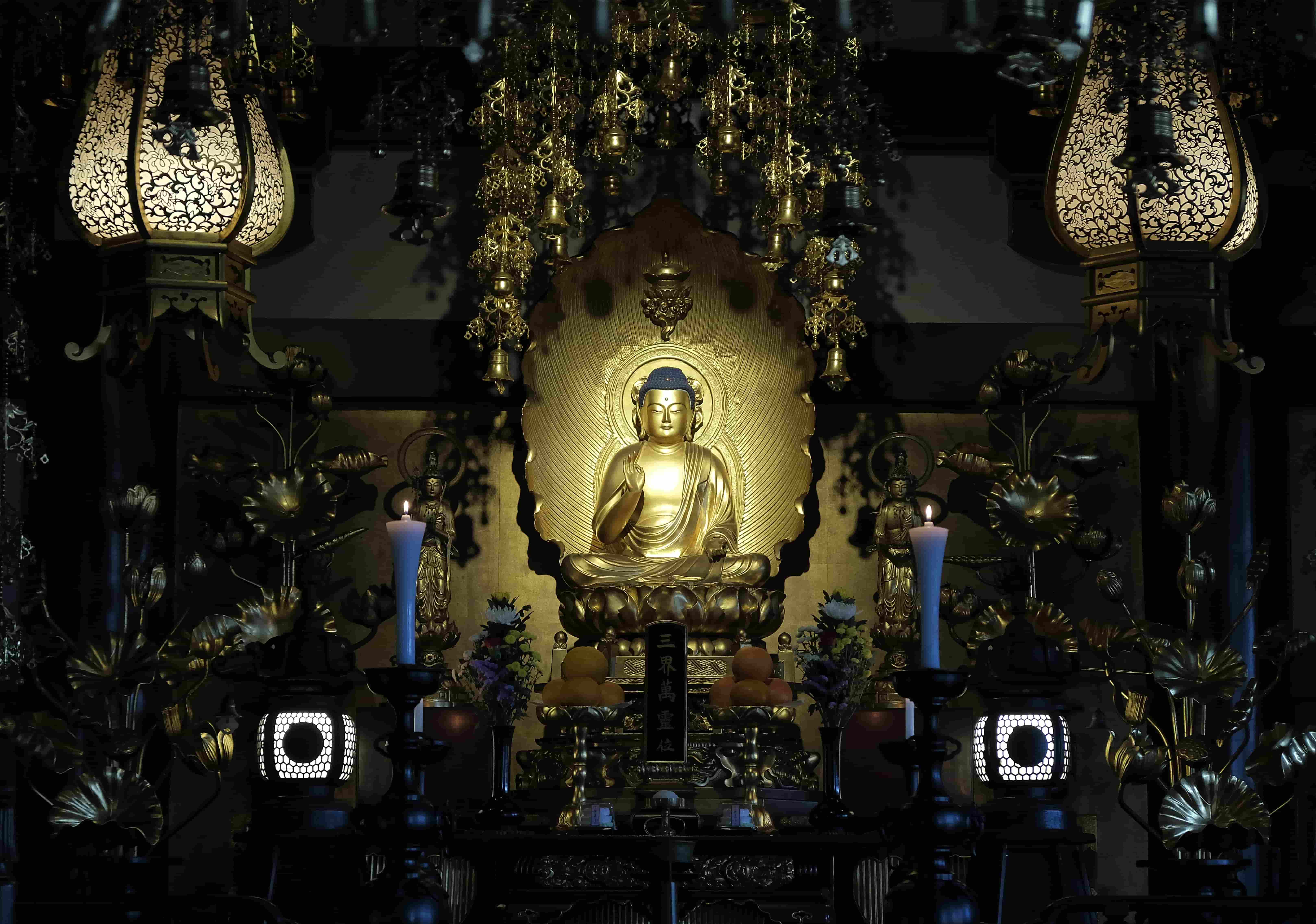 御本尊の阿弥陀如来・観音勢至両菩薩像は、三回目の火災で御本尊を焼失したため、十八世聴譽和尚の代の文化十四(1817)年に、大本山増上寺扁誉台下より供養料十両をつけてお下げ戴いたものです。四回目の火災の時には御本尊や大型の須弥壇(しゅみだん)を担ぎ出したものの、大切な過去帳を焼失してしまいました。